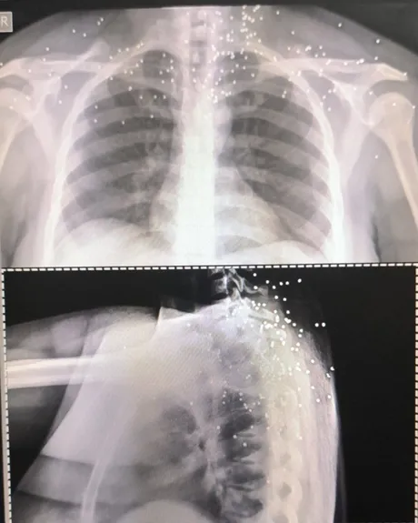 در پرونده «علی»، بیش از ۱۷۴ ساچمه در قفسه سینه راست دیده میشود. تراکمی که نشان میدهد شلیک از فاصله بسیار نزدیک انجام شده است. ریه راست او آسیب شدید دیده و تجمع خون و هوا در اطراف آن مشاهده میشود.