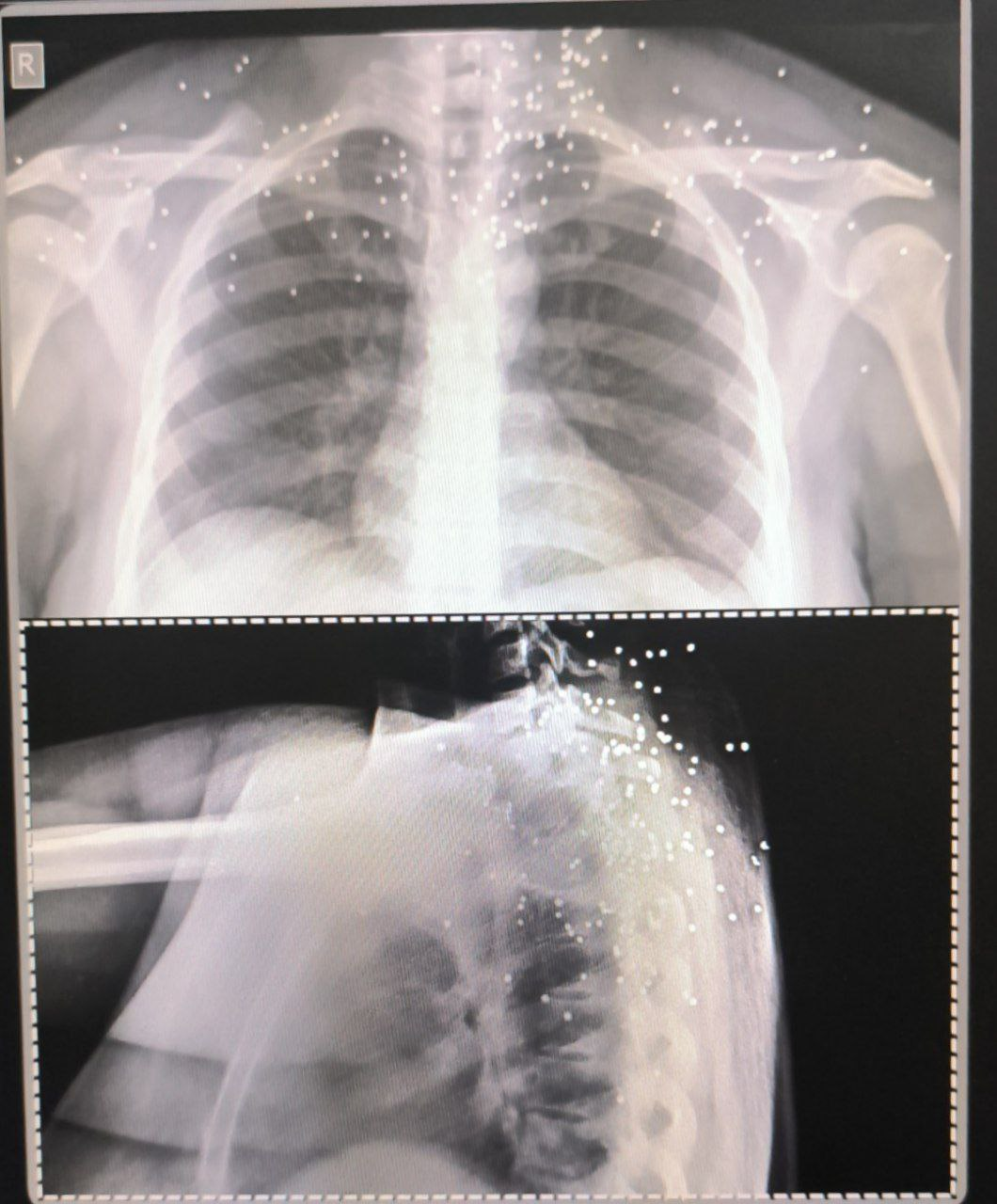 در پرونده «علی»، بیش از ۱۷۴ ساچمه در قفسه سینه راست دیده میشود. تراکمی که نشان میدهد شلیک از فاصله بسیار نزدیک انجام شده است. ریه راست او آسیب شدید دیده و تجمع خون و هوا در اطراف آن مشاهده میشود.