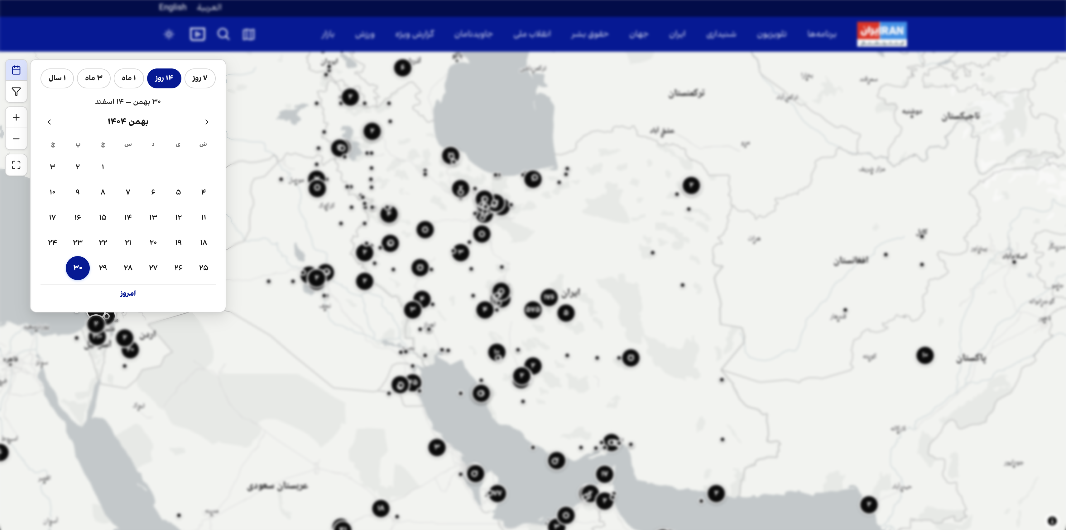 یکی دیگر از امکانات این نقشه، فیلتر زمانی است. کاربران میتوانند بازه زمانی مورد نظر خود را انتخاب کنند تا خبرهای همان دوره روی نقشه نمایش داده شود.