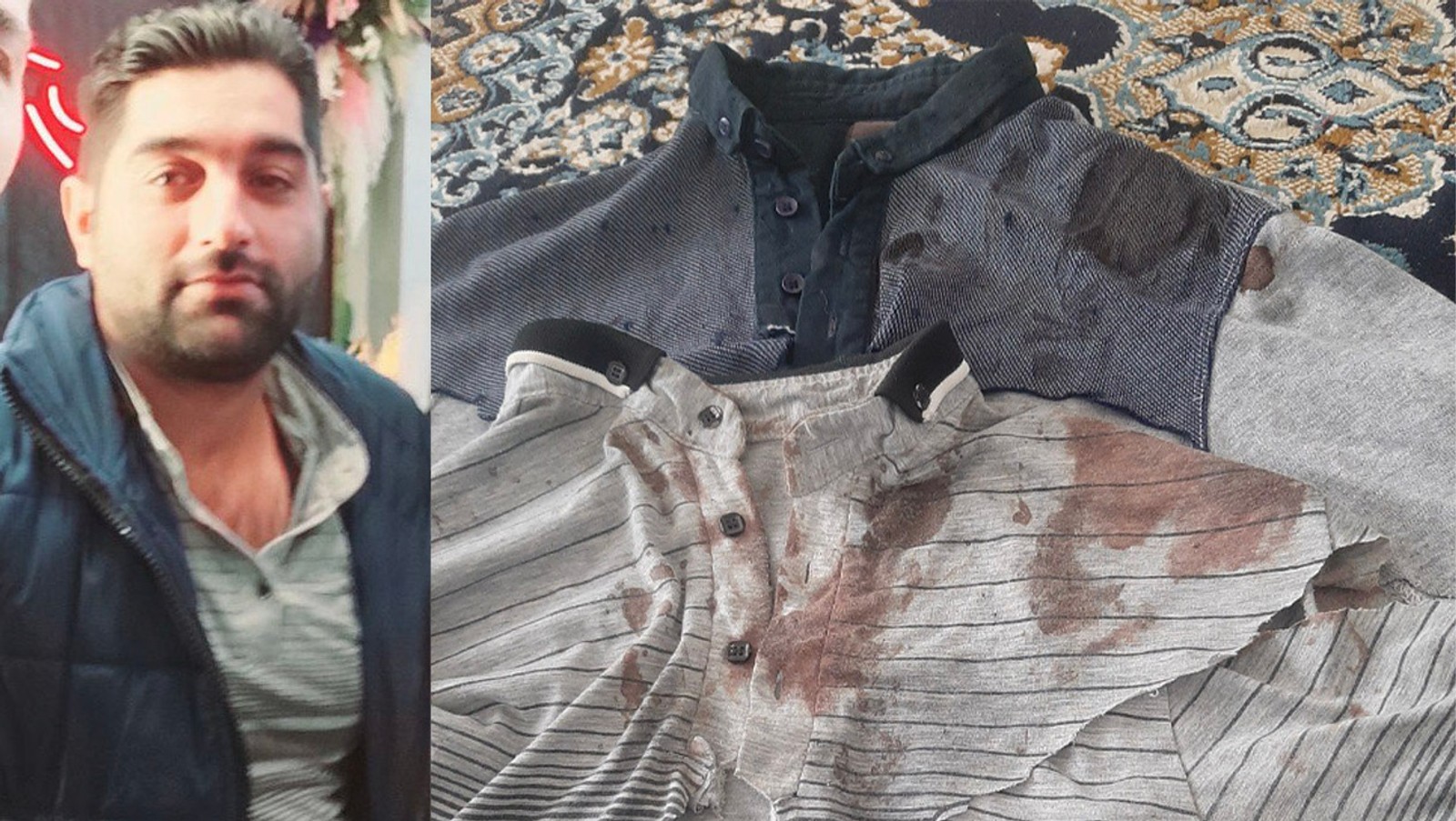 تصویر لباس‌های خونین مصیب نظامی به همراه تصویری از او که یکی از این پیراهن‌ها را به تن داشته است