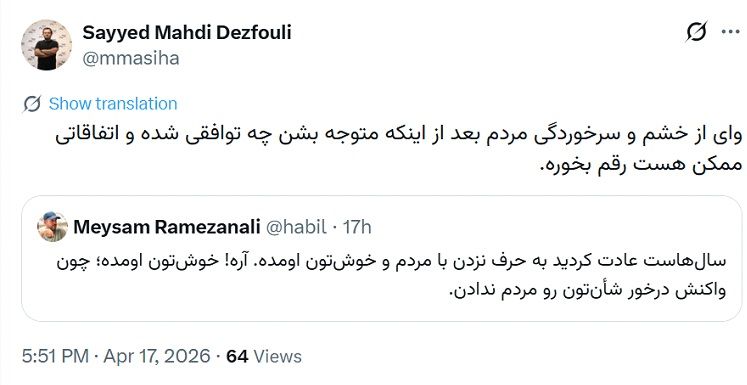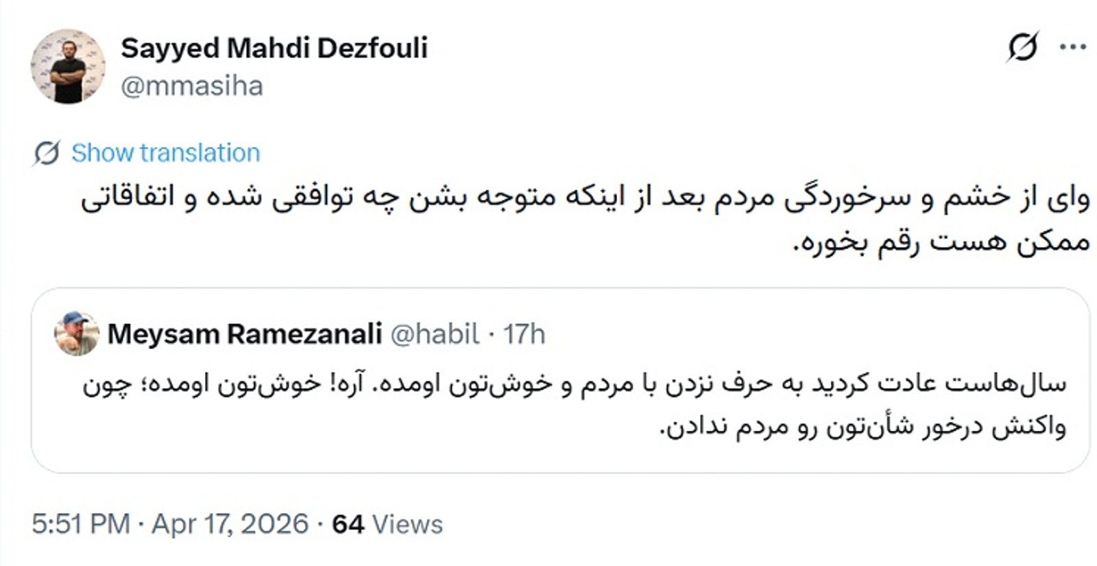 نمونه‌ای از سرخوردگی بدنه ایدئولوژیک حکومت را نیز می‌توان در این توییت دید: