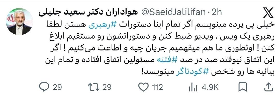 وقتی حساب هواداران جلیلی می‌نویسد «اگر اینها دستور رهبری است، ویدئو آن را منتشر کنید»، یعنی اعتماد بدنه به مرکزیت قدرت از بین رفته است.