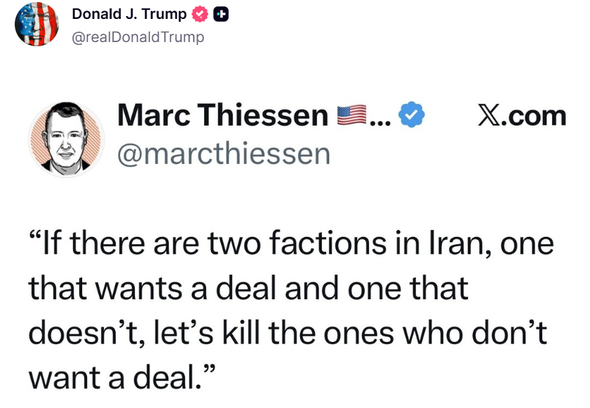 ترامپ در این پست نوشت: «نیروهای دریایی جمهوری اسلامی در کف دریا قرار دارند، نیروی هوایی آن نابود شده است، سامانه‌های ضدهوایی و راداری آن از بین رفته‌اند، رهبرانش دیگر در میان ما نیستند.»