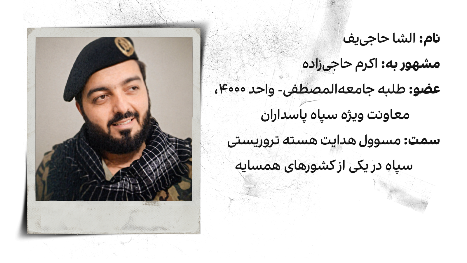 منابع آگاه به موضوع به ایراناینترنشنال گفتند یکی از نیروهای تحت نظارت محمدی، الشا حاجیاف، ۳۷ ساله و تبعه یکی از کشورهای همسایه ایران، به عنوان طلبه در جامعهالمصطفی تحصیل میکند. او که با نام اکرم حاجیزاده نیز شناخته میشود، به اتهام تروریسم تحت تعقیب پلیس بینالملل، اینترپل، است، در ایران پناه گرفته و اکنون برای نهادهای اطلاعاتی جمهوری اسلامی کار میکند.