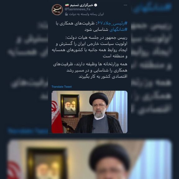 وكالة أنباء "تسنيم" المقربة للحرس الثوري والأمن الإيراني، تنشر على صفحتها هاشتاغ "#رئيسي جلاد 88"، ضمن خبر عن الرئيس الإيراني. وقد تم حذف هذه التغريدة بعد دقايق.