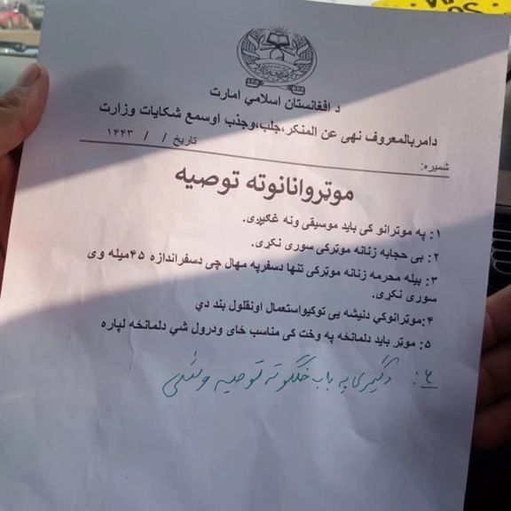 يقول مواطنو العاصمة كابول إنه تم توزيع خطاب توصية من وزارة الأمربالمعروف والنهي عن المنكر في حكومة طالبان على سائقي سيارات الركاب، حيث تم توجيههم بعدم تشغيل الموسيقى في سياراتهم، وعدم نقل "النساء غير المحجبات".