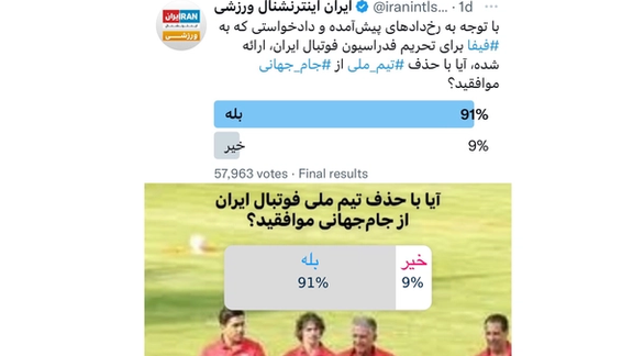 في استطلاع للرأي أجرته "إيران إنترناشيونال"، صوّت 91 في المائة من المشاركين لاستبعاد المنتخب الإيراني من كأس العالم. وقد شارك حوالي 60 ألف شخص في هذا الاستطلاع عبر "تويتر".