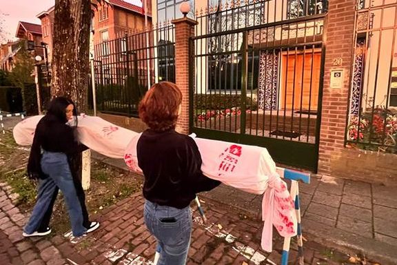داعمون للانتفاضة الشعبية في إيران وضعوا جثتين رمزيتين أمام السفارة الإيرانية في لاهاي