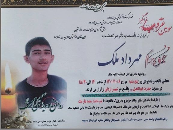 مقتل المراهق مهرداد ملك (17 عاما)، على أيدي عناصر الشرطة الإيرانية في نواحي مدينة قزوين، شمالي البلاد. وفقا للتقارير التي تلقتها "إيران إنترناشيونال فإن الضحية كان في سيارة صديقه وقت إطلاق النار، وأن مراسم تأبين مهرداد ملك ستقام يوم غد الخميس في بلدة أرداق قزوين.