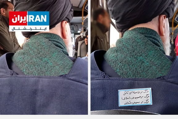 بعث مواطن من مشهد، شمال شرقي إيران، صورة إلى "إيران إنترناشيونال" تظهر أنه قام بإعداد ملصقات كتب عليها شعارات مناهضة للنظام الإيراني، وقد علق إحداها على عباءة رجل دين كان في الحافلة.