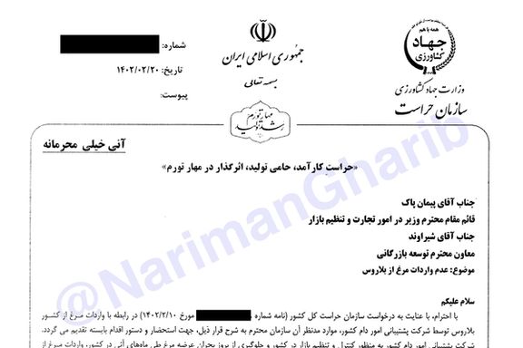 الناشط الإيراني نريمان غريب، أشار إلى رسالة "سرية للغاية" تم تسريبها من وزارة الزراعة الإيرانية تتحدث عن لجوء إيران إلى استيراد الدجاج من بيلاروسيا، وقد كشفت الرسالة عن احتمالية تلوث الدجاج البيلاروسي بالإشعاع النووي ونصحت بتجنبه.
