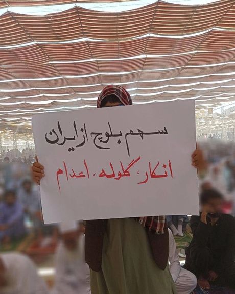 مواقع التواصل الاجتماعي في إيران تنشر صورة يحملها أحد المصلين في زاهدان إيران أثناء احتجاجات اليوم، كتب عليها أن نصيب بلوشستان في إيران هو: عدم الاعتراف والرصاص والإعدام.