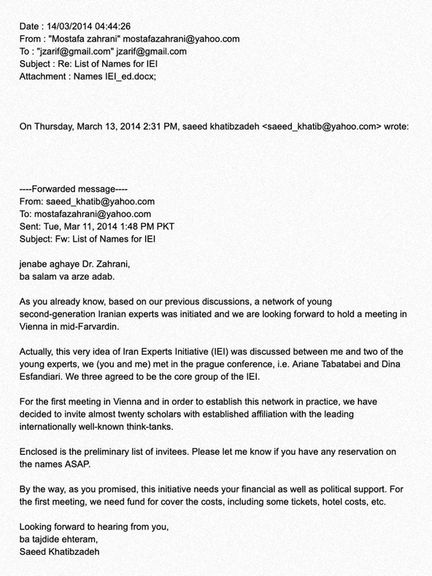 وفي بريد إلكتروني آخر أُرسل بتاريخ 11 مارس (آذار) 2014، قال خطيب زاده لزهراني: "لقد تمت مناقشة فكرة مشروع الخبراء الإيرانيين بيني وبين خبيرين شابين كنا (أنا وأنت) قد التقينا بهما في مؤتمر براغ:وهما أرين طباطبائي ودينا اسفندياري. اتفقنا نحن الثلاثة على أن نكون النواةالرئيسية لخطة خبراء إيران.