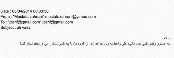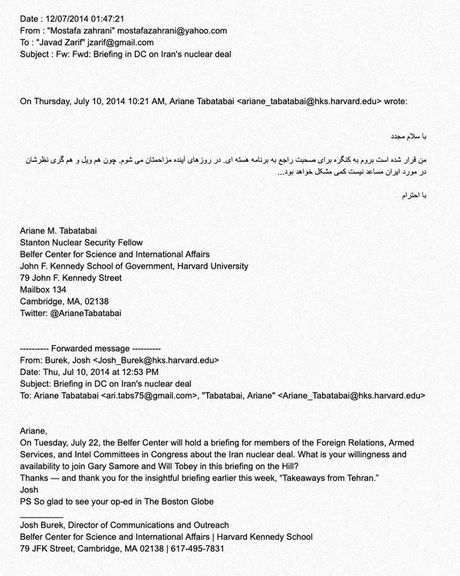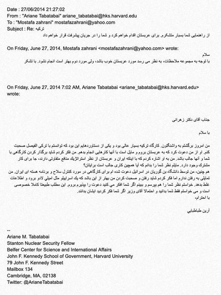 وفي 4 يونيو (حزيران) 2014، أرسل بريداً إلكترونياً إلى زهراني وأرفق مقالاً بعنوان: "المخاطر المعرفية للدبلوماسية النووية مع إيران" وكتب: "أنا في انتظار تعليقاتكم وملاحظاتكم".