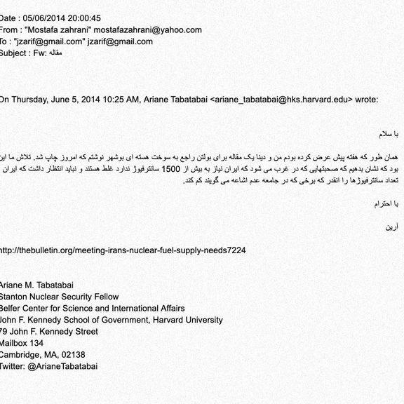 وأرسلت طباطبائي رابط المقال إلى زهراني، وقالت: "كما ذكرت الأسبوع الماضي، كتبت أنا ودينا مقالاً للنشرة حول الوقود النووي في بوشهر، وقد نُشرت اليوم. وكنا نحاول في المقال إظهار أن الحديث في الغرب عن أن إيران لا تحتاج إلى أكثر من 1500 جهاز طرد مركزي هو حديث خاطئ، ولا ينبغي لنا أن نتوقع من إيران أن تخفض عدد أجهزة الطرد المركزي بالقدر الذي يقوله البعض". وقد أرسل زهراني هذه الرسالة الإلكترونية إلى ظريف في نفس اليوم.