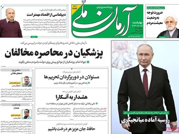 أشارت صحیفة "آرمان ملي" إلى تقرير "بلومبورغ" عن وساطة روسية بين إيران والولايات المتحدة الأميركية بتدخل من الرئيس الروسي فلاديمير بوتين، مشيرة إلى صمت المسؤولين الإيرانيين على هذا التقرير حتى الآن، حيث لم يصرحوا سلبا أو إيجابا حول الموضوع.