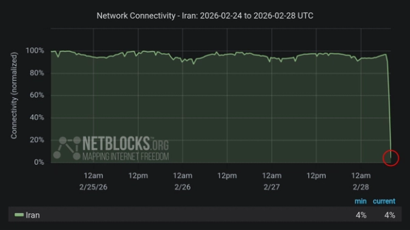 أفادت منظمة "نت بلوكس"، المعنية بمراقبة أمن الشبكات وحرية الإنترنت، بأن البيانات تظهر دخول إيران في حالة انقطاع شبه كامل للإنترنت، حيث انخفضت نسبة الاتصال بالشبكة في عموم البلاد إلى 4 في المائة فقط من المستويات المعتادة.