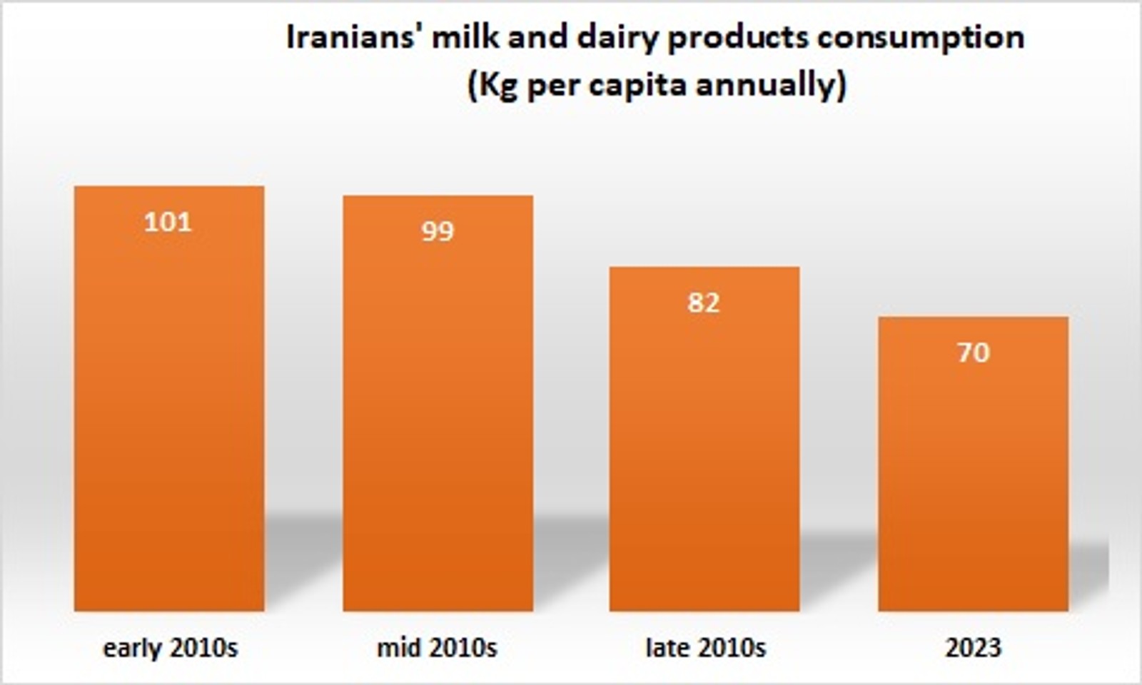 This month, Mohammad Reza Bani-Taba, the spokesman for Iran’s Dairy Industry Association, announced that per capita milk and dairy consumption in Iran has dropped to 70 kg/year, which is less than half the global average.