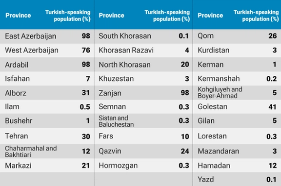 To better understand what seems to be a strong ethnic factor, we can consult the chart below, which shows the Azari or Turkish speaking population in each province.