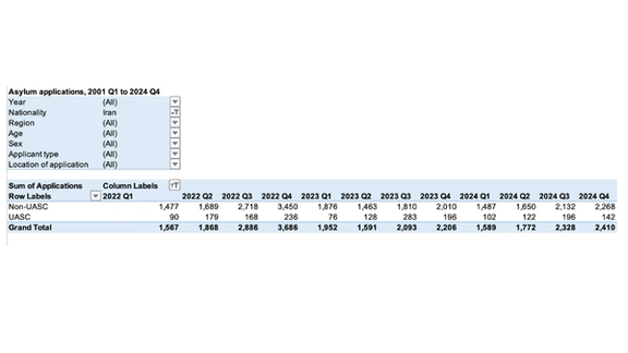 A further analysis of the data suggests a notable increase in asylum applications from Iranians, particularly in 2022, with the highest surge occurring in Q4 of that year, with 3,686 applications.