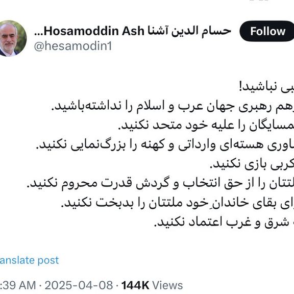 On Tuesday, Ashna made a now deleted post on X: "Do not be Libya! Do not harbor the illusion of leading the Arab world and Islam. Do not unite your neighbors against you. Do not exaggerate outdated, imported nuclear technology... Do not ruin your people for the survival of your family. Do not trust the East or the West."