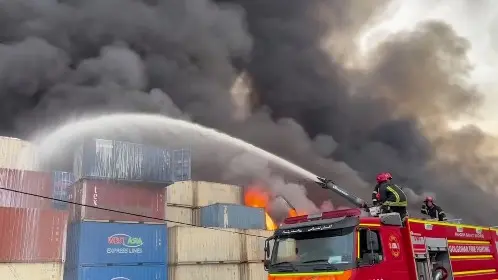 Emergency teams have not yet fully contained the fire, which continues to threaten key parts of the port.