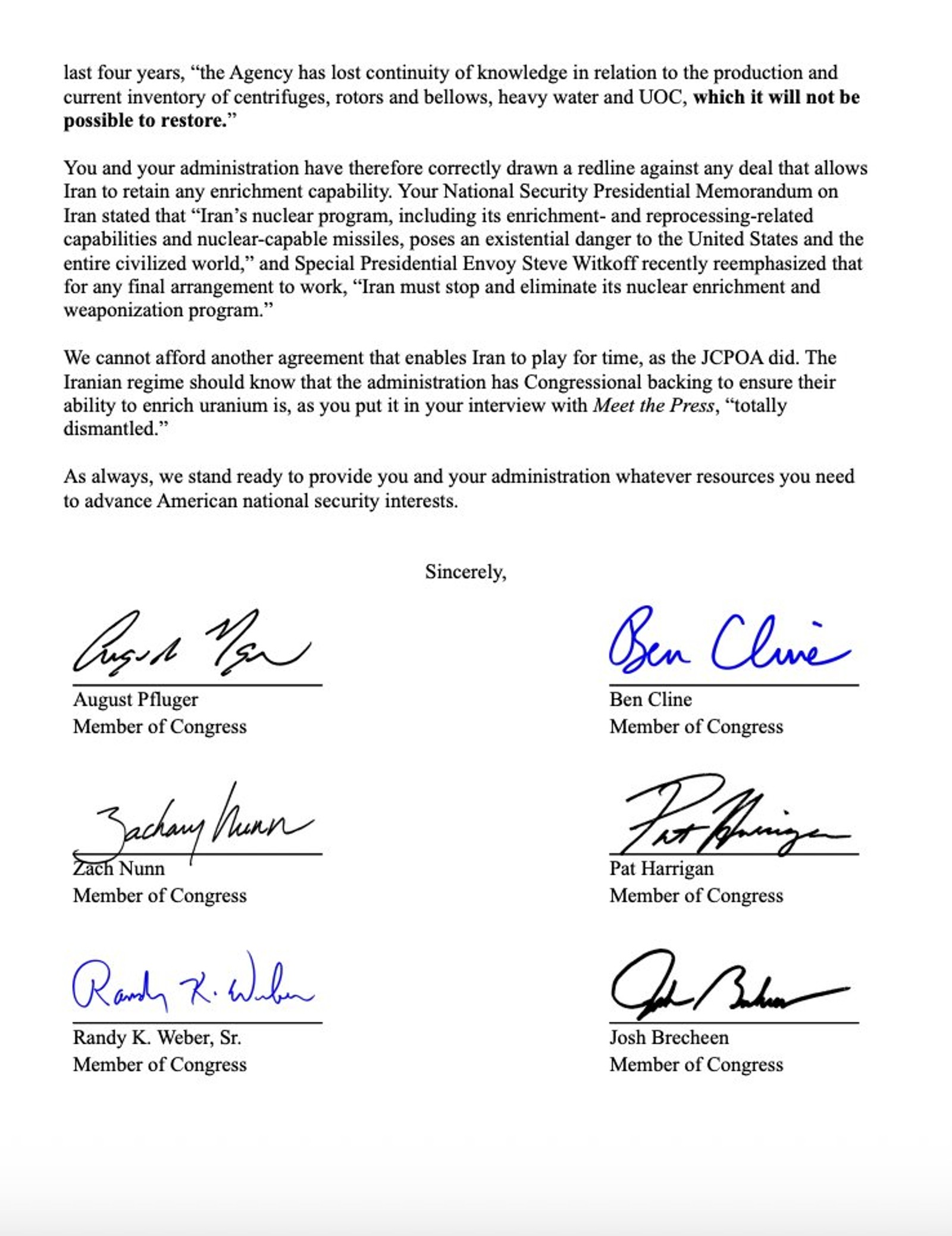 “You have rightly drawn a red line against any deal that permits uranium enrichment,” they wrote. “We stand ready to support your administration with whatever tools are necessary to protect American national security.”