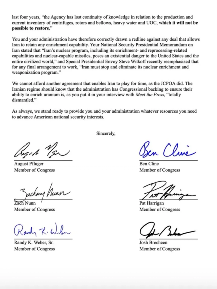 “The United States cannot afford another deal that gives Iran room to maneuver,” the lawmakers wrote. “The regime must be stripped of all enrichment capacity — even for peaceful energy purposes.”