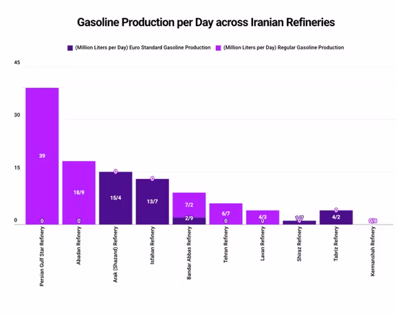 The Persian Gulf Star refinery, Iran’s largest by volume, produces 39 million liters/day, but none of its output qualifies for Euro-grade certification.