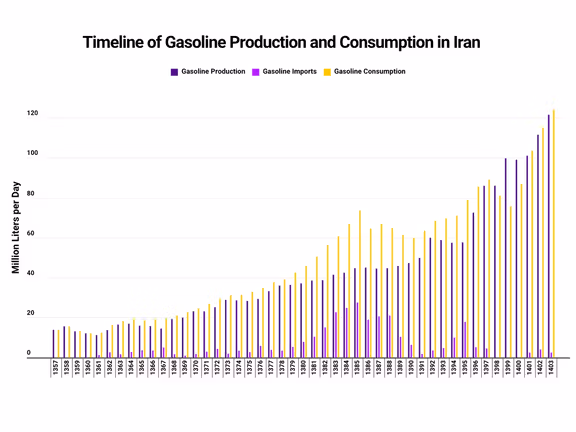 Iran produced an average of 101 million liters of base gasoline per day in 2024, rising to 121 million liters per day after incorporating roughly 20 million liters of off-site additives. However, daily domestic demand stands at 123.5 million liters, leaving a shortfall of 2.5 million liters.
