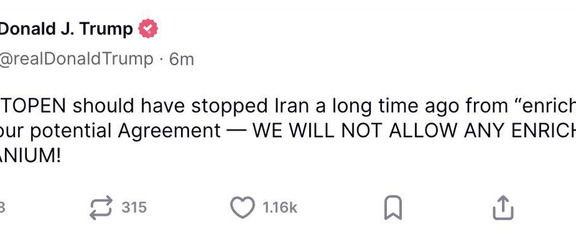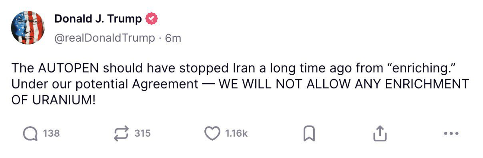 “The AUTOPEN should have stopped Iran a long time ago from “enriching.” Under our potential Agreement — WE WILL NOT ALLOW ANY ENRICHMENT OF URANIUM!” he said on Truth Social.