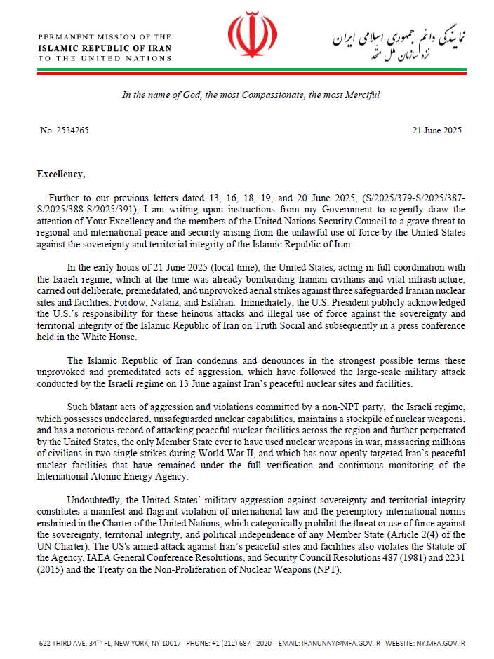 “The Islamic Republic of Iran urgently demands that the Security Council convene without delay to address this clear act of aggression, condemn it in the strongest possible terms, and take all necessary measures within its mandate under the UN Charter to ensure the perpetrators are held fully accountable and do not escape punishment,” the letter said.