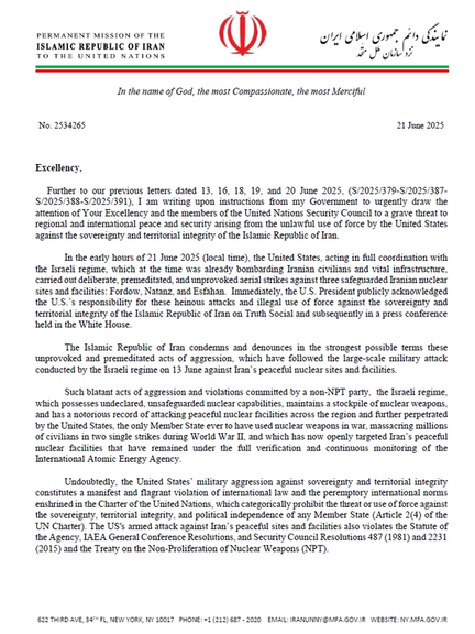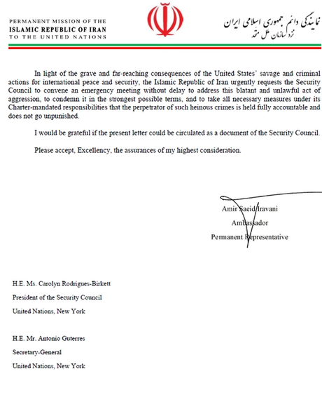 In a letter addressed to the Council, Iran condemned what it described as a "blatant and unlawful act of aggression" and urged the Security Council to respond immediately.