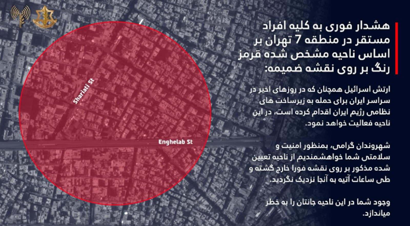 The Israeli military issued a new evacuation warning to the residents of an area in Tehran's District 7, saying it will be operating in this area.