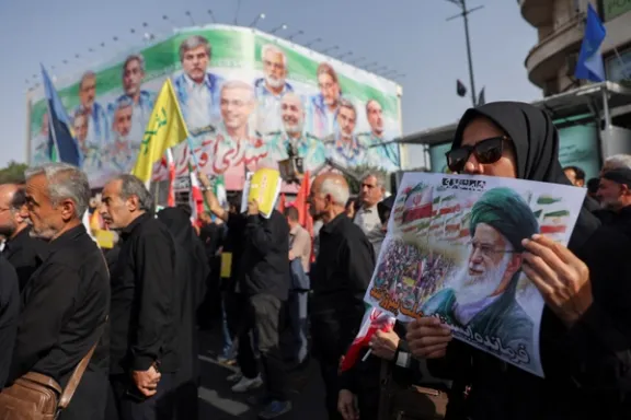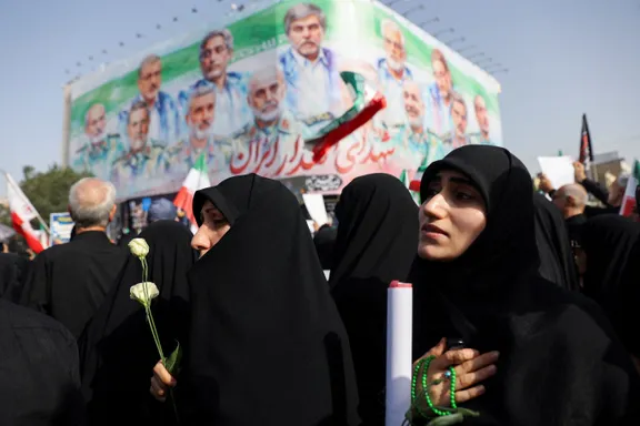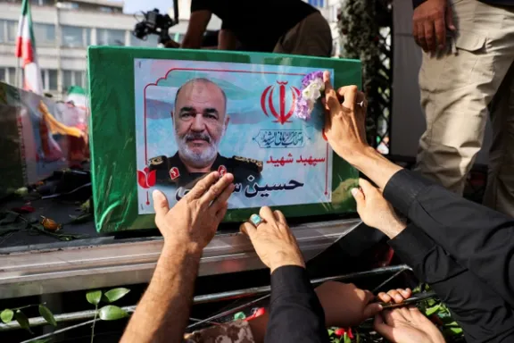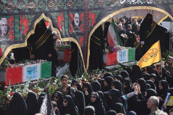 People attend the funeral of Iranian commanders and scientists killed in Israeli strikes, in Tehran, June 28, 2025.