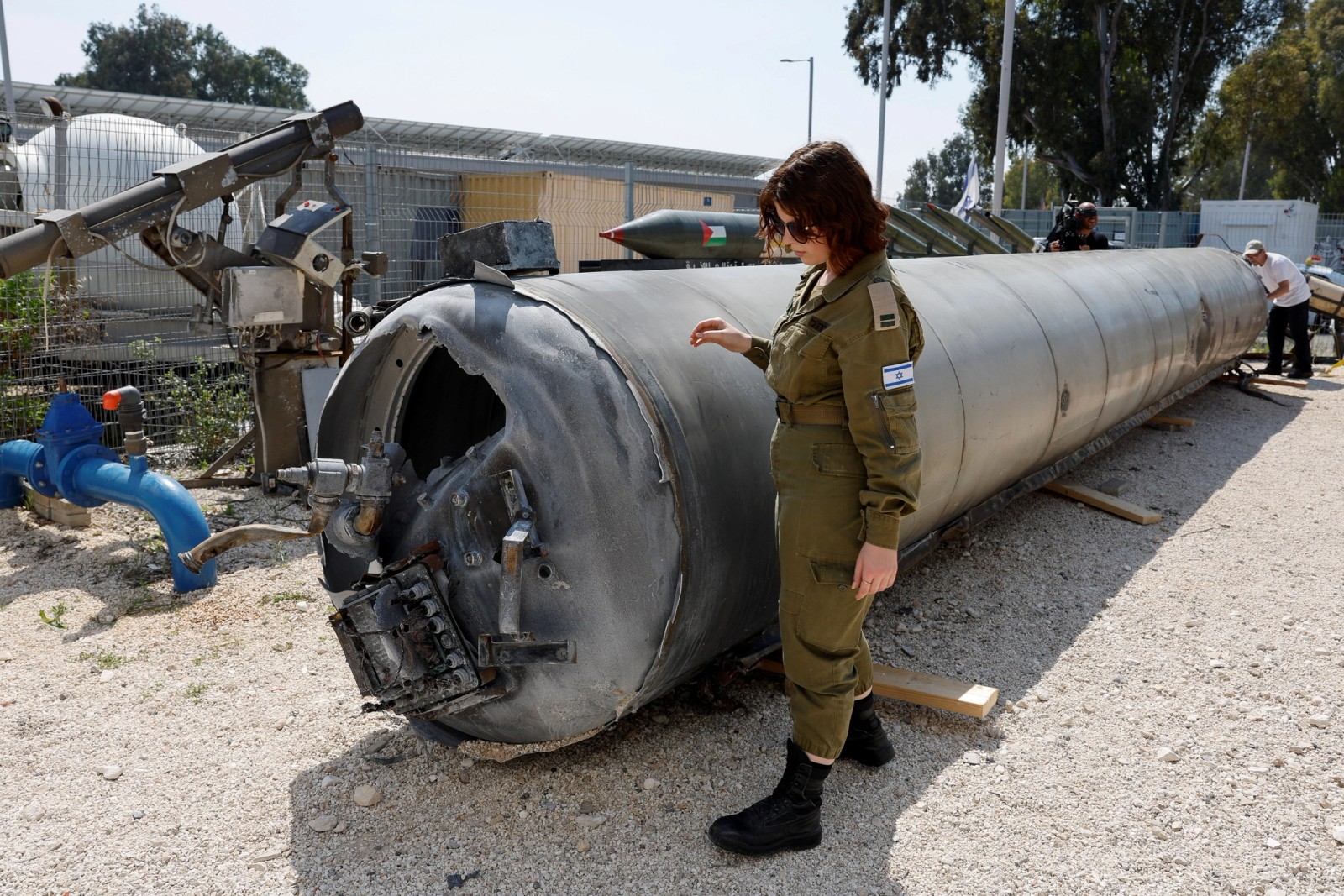 Israel's military displays what they say is an Iranian ballistic missile which they retrieved from the Dead Sea after Iran launched drones and missiles towards Israel, at Julis military base, in southern Israel April 16, 2024.