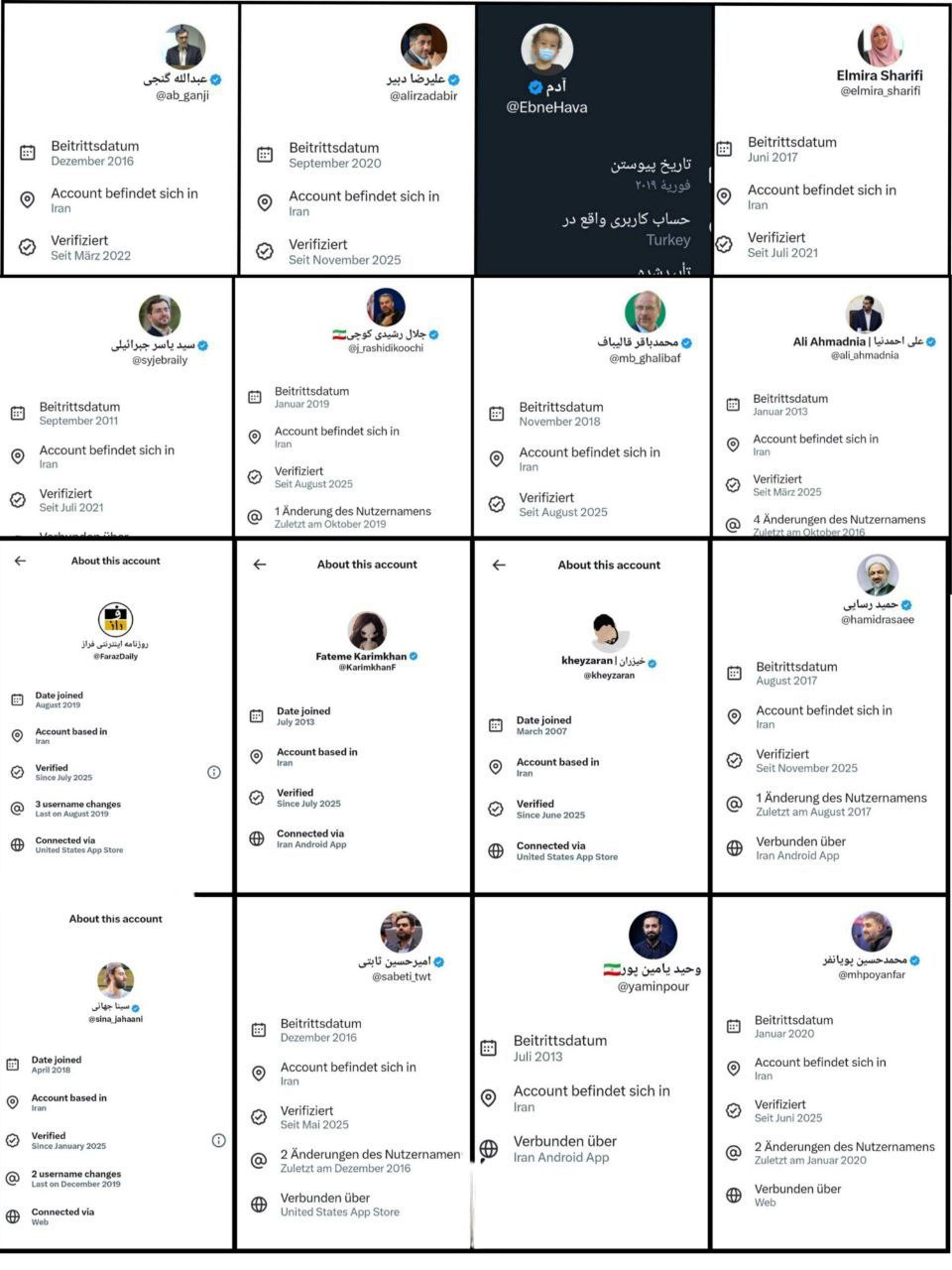 Like the Scottish-themed cluster, those accounts relied on localized imagery and political language until the location tags revealed their origins. Israel’s Persian-language foreign ministry account later branded one such operator a “deceiver.”