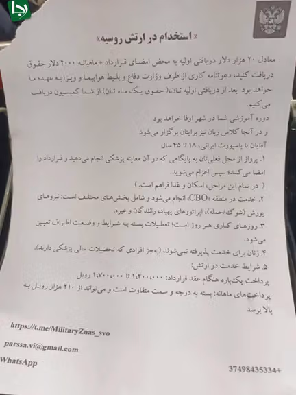 The denial followed a report by the Tehran-based outlet Rouydad24, which said that leaflets distributed near the Russian Embassy in Tehran invited Iranian men to join the Russian army with promises of dollar payments and contracts “directly under the Ministry of Defense of the Russian Federation.”