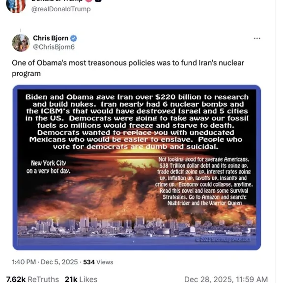 “One of Obama’s most treasonous policies was to fund Iran’s nuclear program,” the post shared by Trump said, alongside an image of a nuclear explosion over New York City and further criticism of Democratic administrations’ Iran policy.