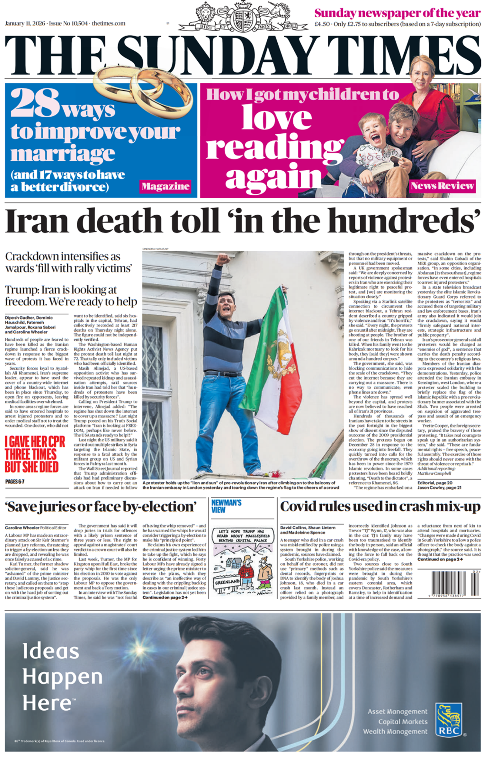 The Sunday Times front page referred to an Iran death toll “in the hundreds,” while The Sunday Telegraph focused on President Donald Trump vowing to help Iranian protesters as his administration discussed military strike options.