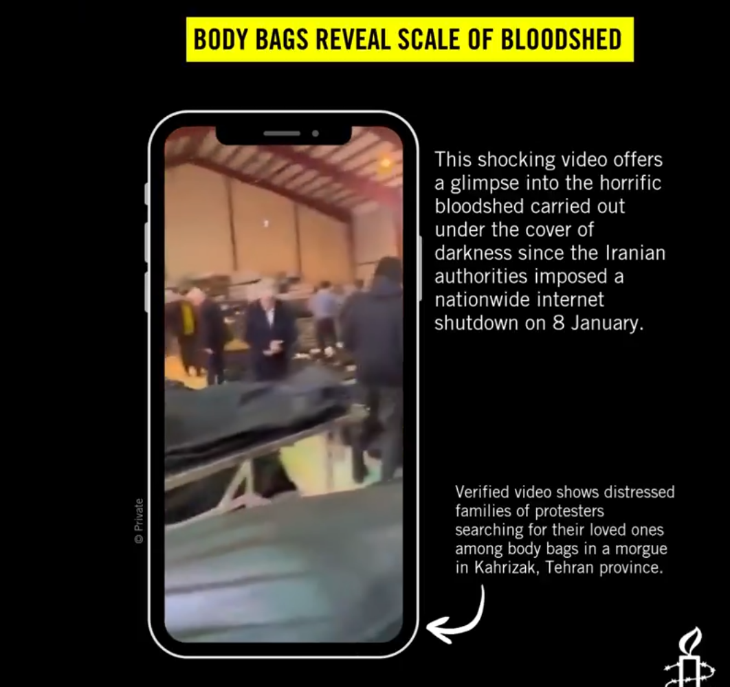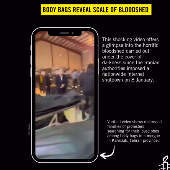 "This is a glimpse into the horrifying bloodshed waged under the cover of darkness by the Iranian authorities since they imposed a nationwide internet shutdown on 8 January," Amnesty International said in a post on X, along with a video of body bags in Kahrizak, southern Tehran, which Amnesty says reveal the scale of bloodshed.