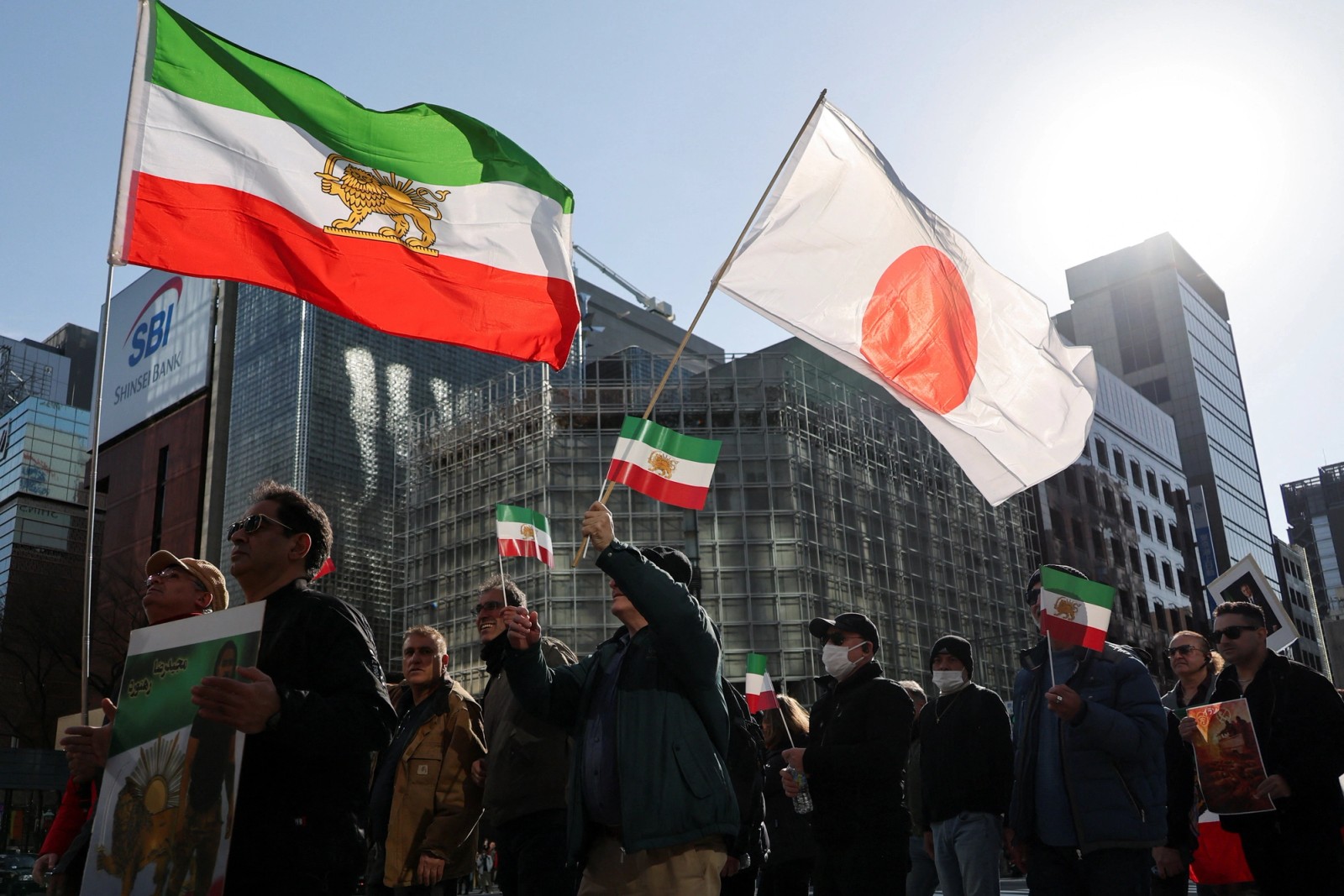 Iranians living in Japan, with taped mouths and carrying signs and flags, march in support of nationwide protests in Iran, in Tokyo, Japan, January 18, 2026.