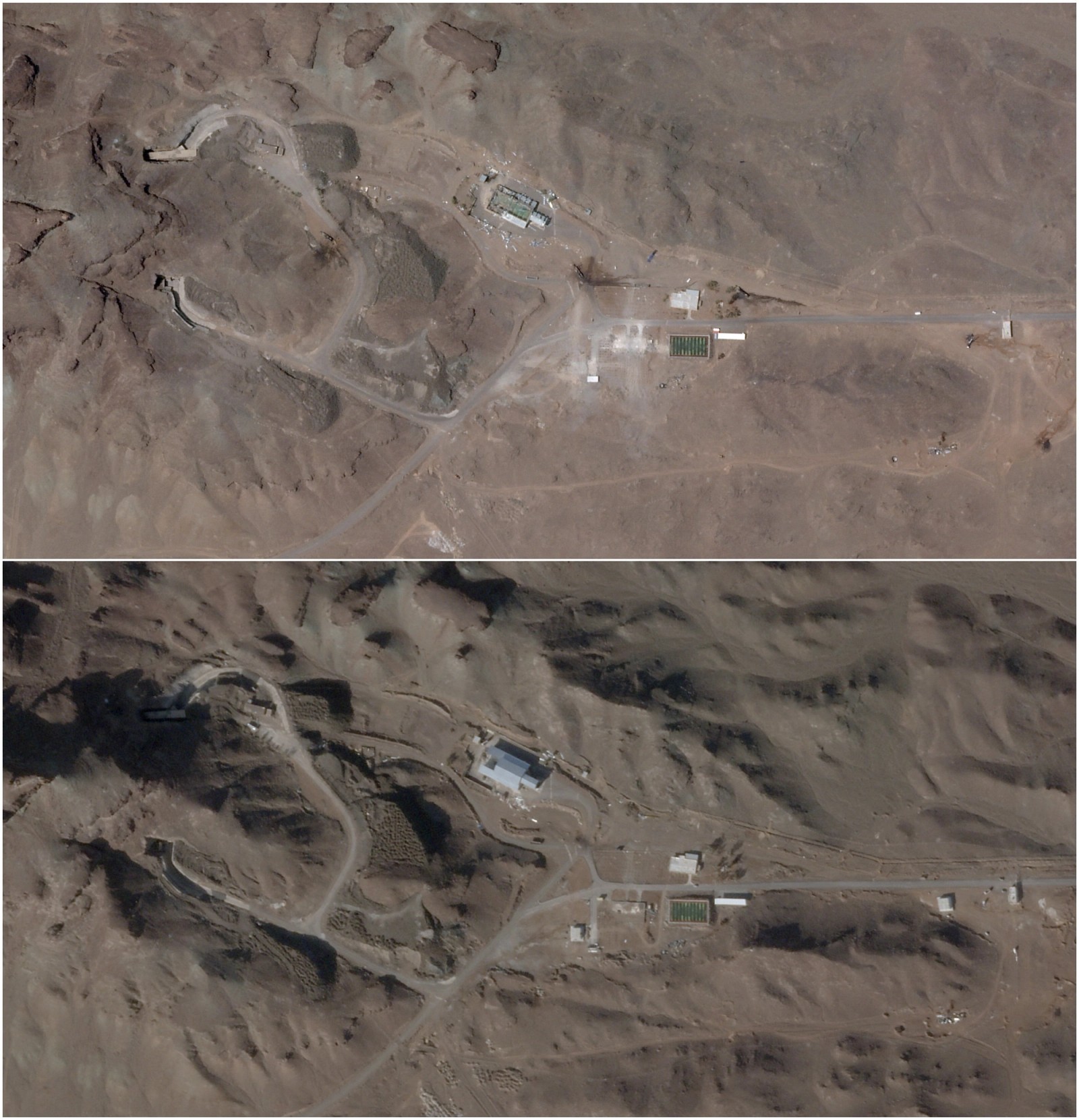 Near the Natanz enrichment site, satellite imagery shows ongoing efforts to strengthen tunnel entrances under a nearby mountain, with heavy equipment and construction activity visible.