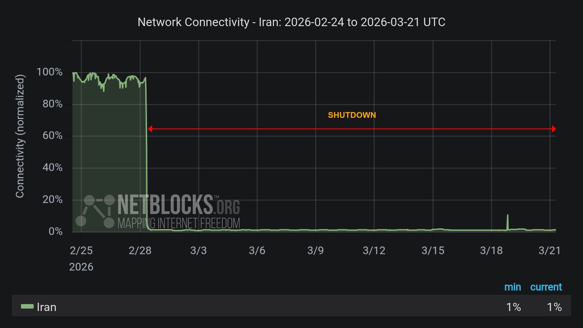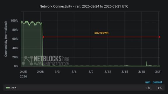 Iran’s internet blackout has entered its third week, with more than 504 hours of disrupted connectivity and the public largely cut off from the global internet, monitoring group NetBlocks said.