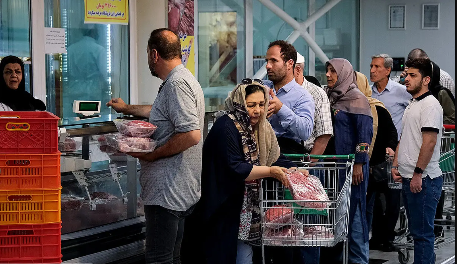 Shoppers queue at a butcher’s counter in Iran as food costs continue to climb.