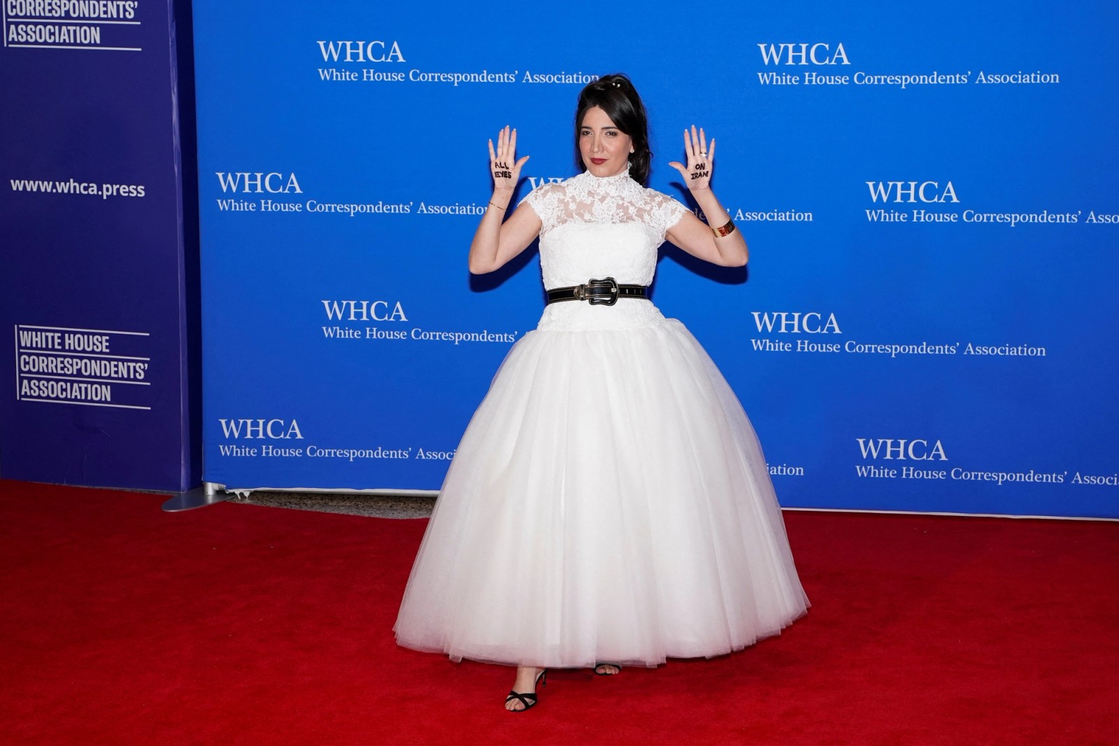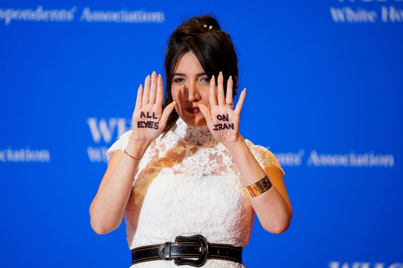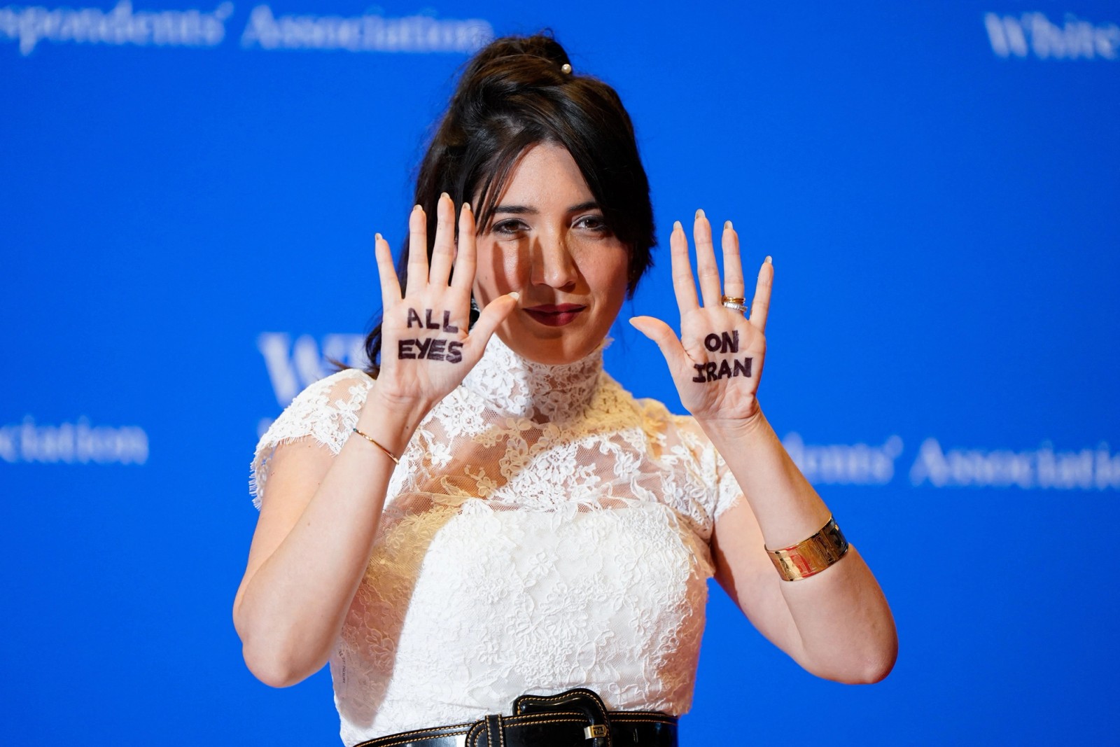 Iranian-American journalist and Helmet to Heels founder Suzanne Kianpour showed a message written on her hands reading "all eyes on Iran" as she posed on the red carpet for the 2026 White House Correspondents' Association (WHCA) dinner in Washington, DC on April 25, 2026.