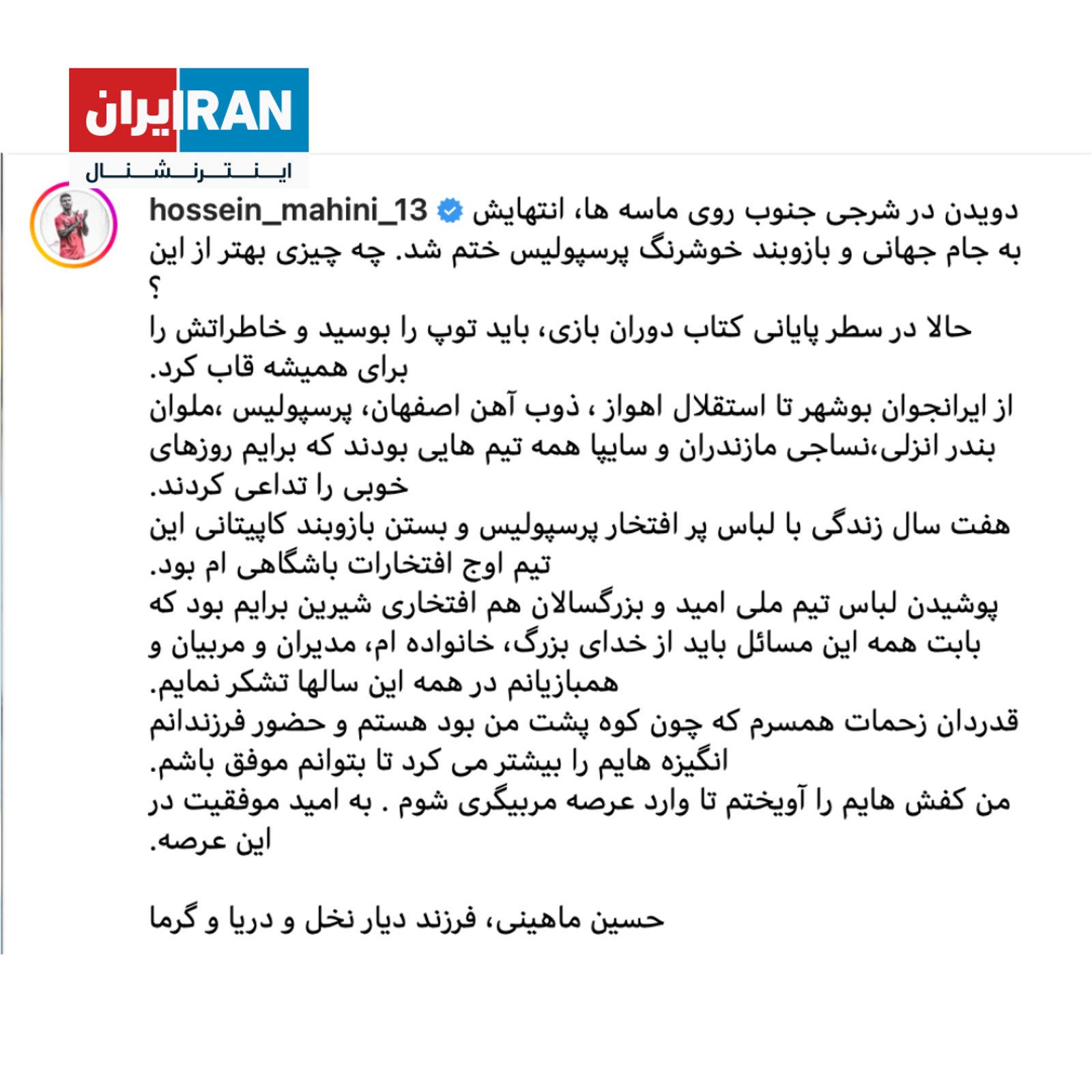 ماهینی نوشته: «قدردان زحمات همسرم که چون کوه پشت من بود هستم و حضور فرزندانم انگیزه هایم را بیشتر می کرد تا بتوانم موفق باشم. من کفش هایم را آویختم تا وارد عرصه مربیگری شوم . به امید موفقیت در این عرصه.»