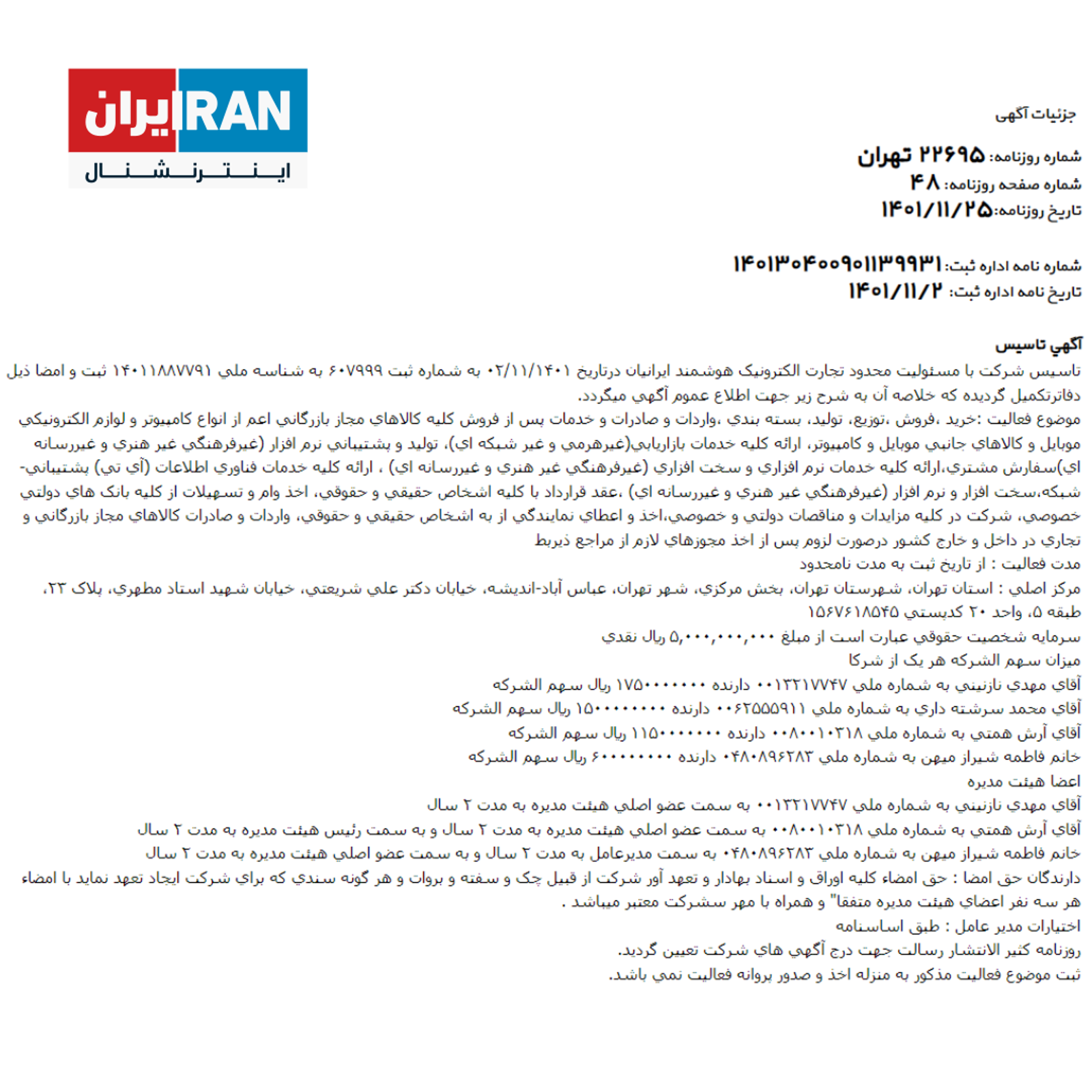 آرش همتی، محمد سررشتهداری، مهدی نازنینی و فاطمه شیرازمیهن این شرکت را با سرمایه اولیه تنها ۵۰۰ میلیون تومان با شرح خدماتی چون خدمات بازاریابی، صادرات و واردات کالاهای الکترونیکی و خدمات پس از فروش آنها و شرکت در تمامی مناقصات و مزایدات دولتی و خصوصی در تاریخ ۲ بهمن ۱۴۰۱ ثبت کردند.
