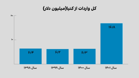 این نمودار کل واردات ایران را از کنیا نشان میدهد که عمدتا هم چای است. معمولا کل کشور سالانه شش میلیون دلار از کنیا واردات داشته اما در سال ۱۴۰۱، واردات از کنیا حدود ۱۰ میلیون دلار افزایش داشته است.