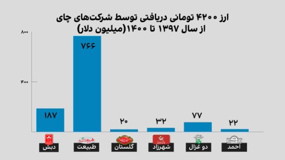 این ماجرا درباره ارز چهار هزار و ۲۰۰ تومانی هم صادق است. گروه چای طبیعت طبق لیست بانک مرکزی طی سالهای ۱۳۹۷ تا ۱۴۰۰ مبالغی به مراتب بالاتر از چای دبش و مجموع عرضهکنندگان دیگر چای، ارز چهار هزار و ۲۰۰ تومانی دریافت کرده است.